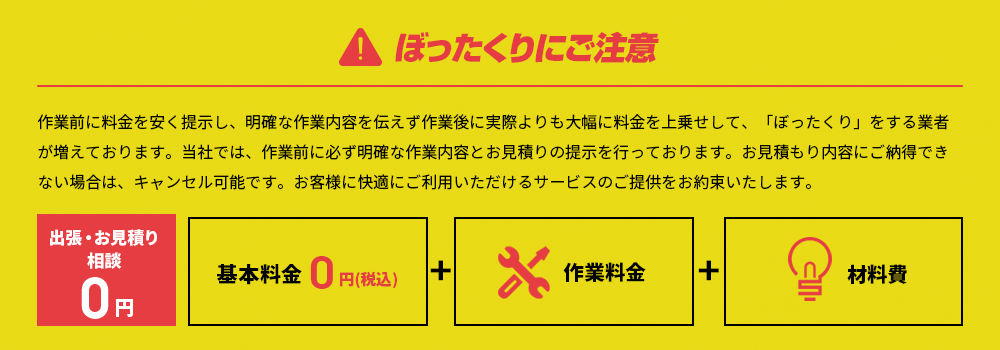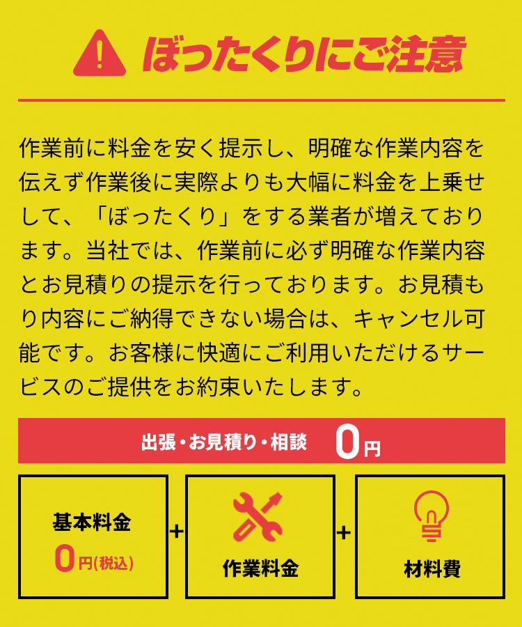 電気トラブルは急に発生するため、修理や交換が必要な場合は予期せぬ出費になります。そこで、お客様にお求めいただきやすいように、業界最安値を意識して日々取り組んでおります。他社様よりも1円でも高い場合はご相談ください。
